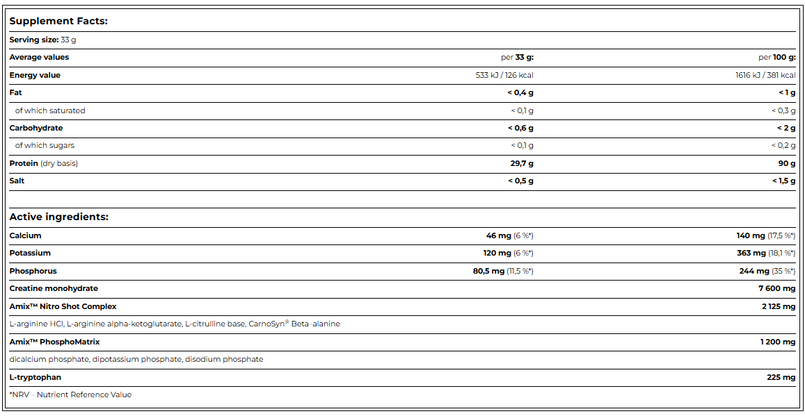 Anabolic Monster Beef Protein besteht aus 90 % enzymatisch hydrolysiertem (vorverdautem) Rinderserumalbumin (hydrolyzed Beef Albumin Protein). Es wurde pro Portion mit 2,5g Kreatin Monohydrat angereichert und enthält einen NITRO SHOT Komplex, bestehend aus L- Arginin HCl, L- Arginin-α-Ketoglutarat, L- Citrullin Base und Beta-Alanin von CarnoSyn® als optimale Nährstoffergänzung. Darüber hinaus enthält MONSTER BEEF eine PhosphoMatrix (Dicalciumphosphat, Dikaliumphosphat, Dinatriumphosphat) und L-Tryptophan. Es löst sich optimal, ist fettarm und zuckerfrei!