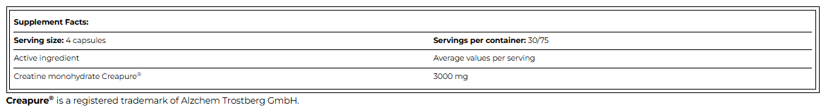 Kreatin (Creapure®) in Kapselform – einfach zu dosieren, denn jede pflanzliche Kapsel enthält 750 mg Creapure® (Kreatinmonohydrat). Kreatin steigert die körperliche Leistungsfähigkeit bei kurzzeitigen, hochintensiven Belastungen. Der positive Effekt wird mit einer täglichen Einnahme von 3 g Kreatin erzielt. 120 Vege Caps