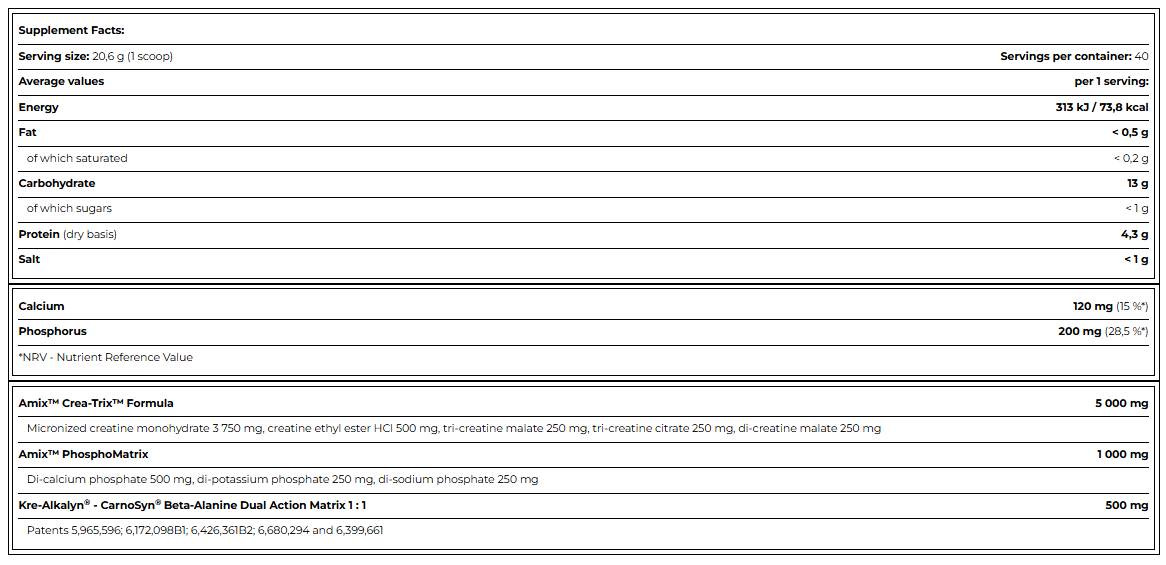 AMIX™ Crea-Trix™ ist ein Kreatinkomplex, der sechs verschiedene Kreatinformen kombiniert: Kreatinmonohydrat, Kreatinethylester-HCl, Trikreatinmalat, Trikreatincitrat, Dikreatinmalat und Kre-Alkalyn®.