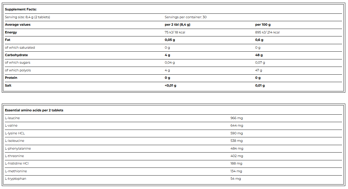 M.A.P.® Muscle Amino Power ist ein Aminosäuren Supplement in Form von Kautabletten, mit den einzigartigen essentiellen Aminosäuren (EAAs) in hochreiner, freier und kristalliner Form. Essentielle Aminosäuren tragen zur Proteinsynthese und zum Erhalt der Muskelmasse bei. Dank der kristallinen Form werden sie schnell vom Körper aufgenommen. M.A.P.® wurde zur Unterstützung des Muskelaufbaus und der Muskelregeneration entwickelt. Es liefert hochwertige essentielle Aminosäuren (L-Leucin, L-Valin, L-Lysin-HCl, L-Isoleucin, L-Phenylalanin, L-Threonin, L-Histidin, L-Methionin, L-Tryptophan), die der Körper nicht selbst herstellen kann.