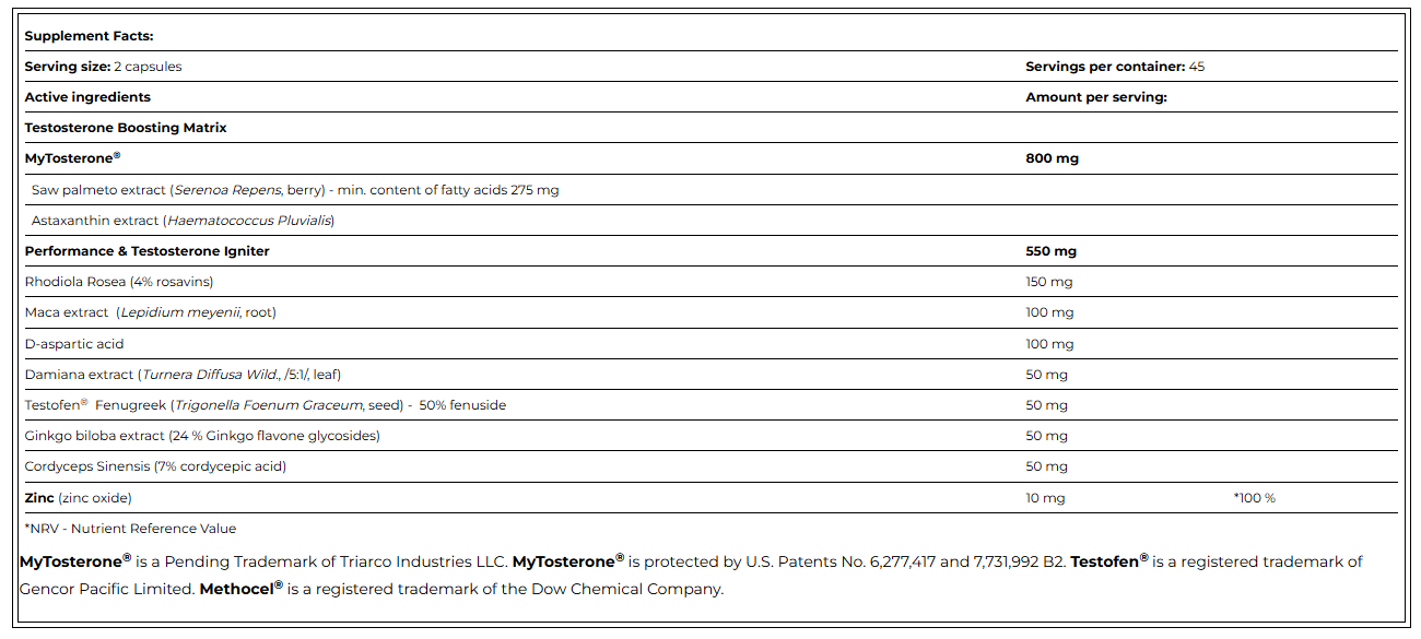 MyTosterone® ist eine angemeldete Marke von Triarco Industries. MyTosterone® ist durch die US-Patente Nr. 6,277,417 und 7,731,992 B2 geschützt. Testofen® ist eine eingetragene Marke von Gencor Pacific Limited. Methocel® ist eine eingetragene Marke der Dow Chemical Company.